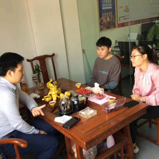 通过与李思琳同学及其同事的座谈交流,了解到她实习的环境很愉悦轻松。同事之间的关系非常友好,工资收入相对丰厚,也能很好地掌握工作岗位的技巧,实习结束后会直接转正。交谈过程中,与学生当面敲定关于顶岗实习转岗、周报要求、就业证明等具体细节,希望学生能保质保量完成顶岗实习的相关工作。