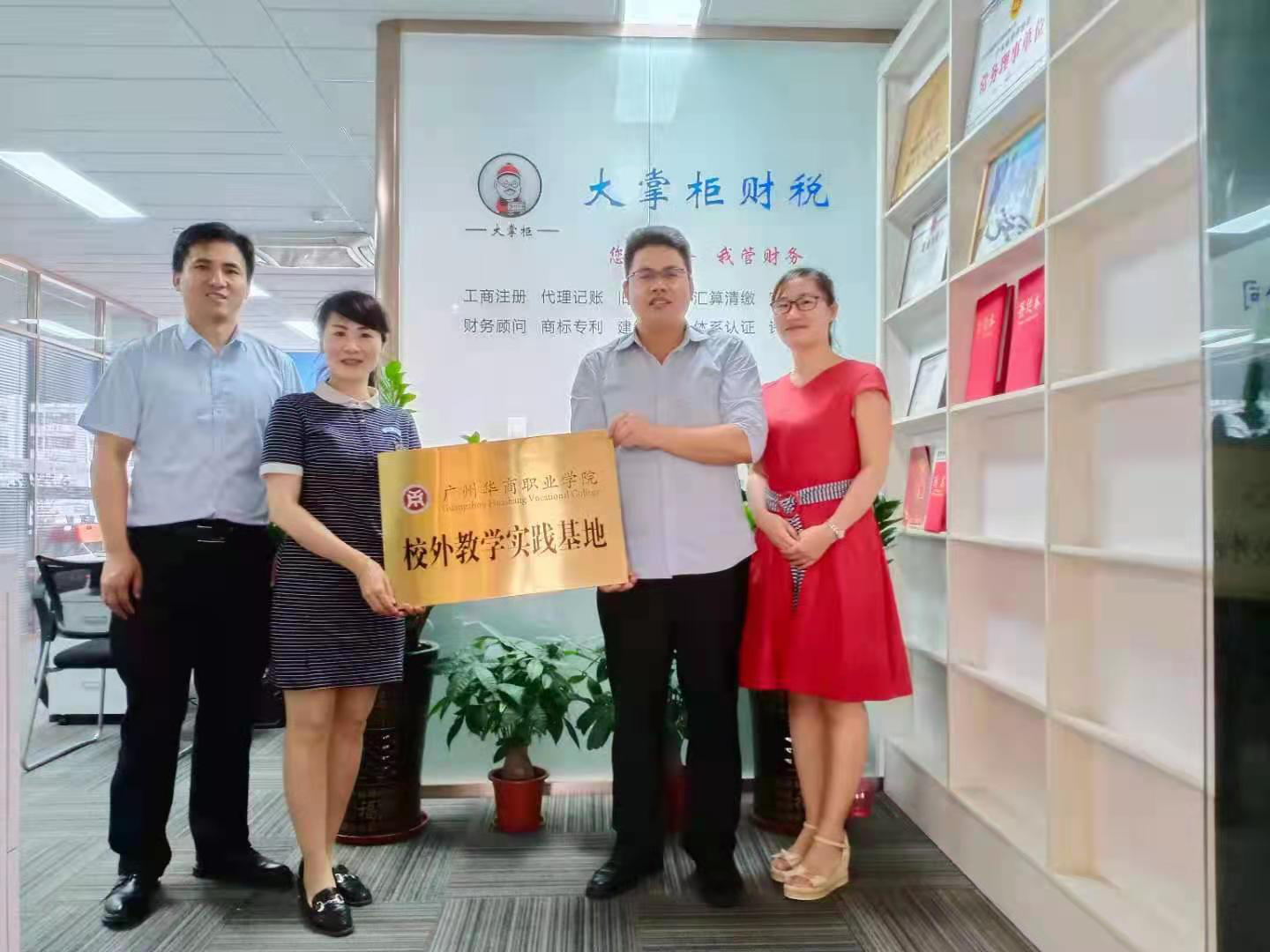 2021年5月11日上午9:30,广州华商职业学院财金学院殷建玲副院长、金融管理教研室负责人郭建主任以及财富管理教研室负责人刘姗主任一行3人先来到广州大掌柜财税服务有限公司举行校外教学实践基地挂牌仪式。