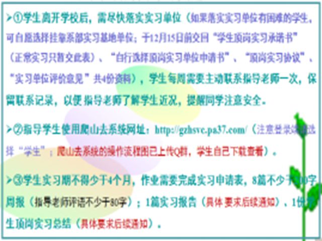 ③ 实习生涯的规划(角色的转换、正确对待实习补贴、注意与人沟通、做好个人发展计划、遵守实习企业规章制度、学会敢于承担责任,承认错误)。