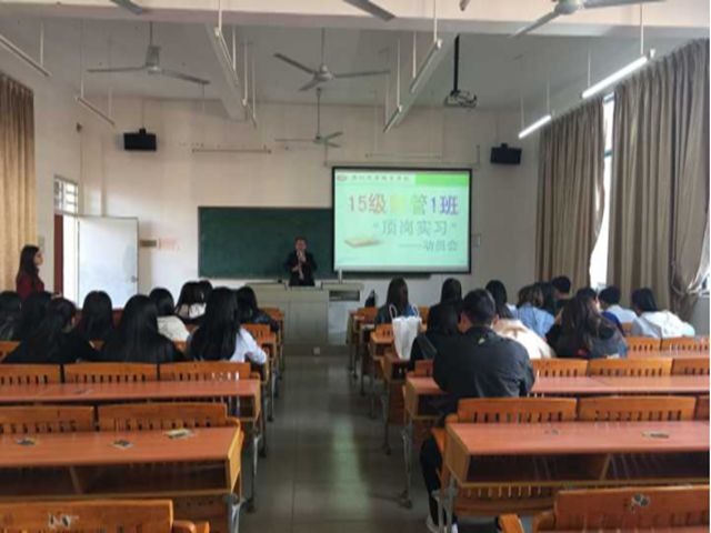 15级财务管理1班于2017年12月11日(星期一)下午16:00在博B506教室召开2018届顶岗实习动员会。动员会由实习指导老师余杰老师主持,25位同学准时出席参加。