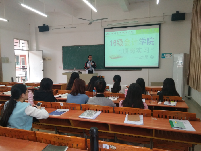 2019届会计学院16级会计(8班)12人;(11班)13人;于2018年11月27日(星期二)下午14:30在博B405教室召开2019届顶岗实习动员会。动员会由实习指导老师余杰老师主持,25位同学准时出席参加。
