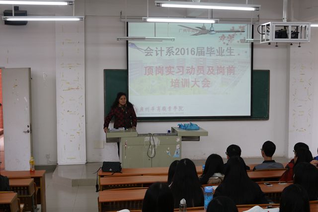 动员会上,会计系王莉丽主任对2016届学生近三年来所做的成绩表示满意和肯定,并代表全系老师向毕业生表示衷心的感谢!感谢三年前选择了广州华商职业学院,选择了会计系;三年来,用汗水和智慧践行了与学校共同成长。并强调了两个问题:第一,毕业实习时要注意的事项和要求;第二,就业诚信问题。要求大家珍惜就业机会,积极主动就业,不依赖,不等待,先就业,再择业。寄语毕业生人无信不立,要认真做好顶岗实习工作,提一些建议和要求,并给毕业生送上了祝福。