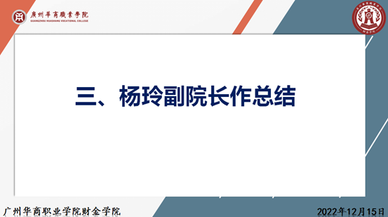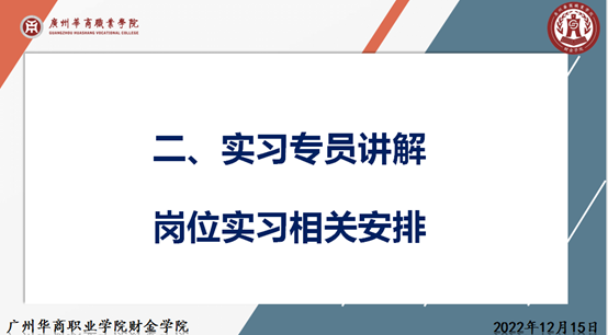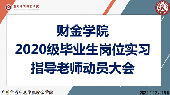 为了推进我院2023届毕业生岗位实习工作,指导学生做好岗位实习,我院于2022年12月15日中午12:10召开了岗位实习指导老师动员大会,参会本次动员大会的人员有:财金学院李哲院长、杨玲副院长、陈少兰副院长、党总支金新凯副书记、各专业负责人以及岗位实习指导老师。