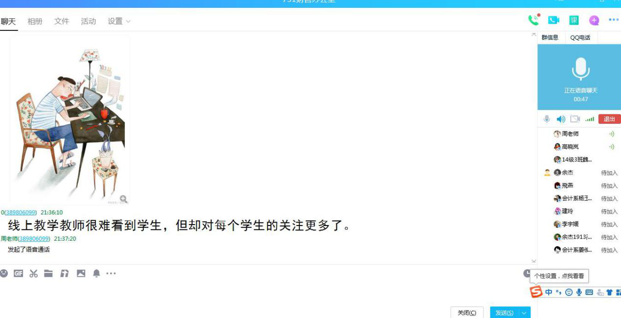 全体教研室教师参与了本次活动,活动通过QQ语音进行。线上上授课更有利于整合优秀网络资源,提高内容质量。老师省下很多教学管理时间,可潜心充分备课。但教师无法把握学生的听课状态,师生交流互动有限。不能否认的是,线上教学确实是线下教学的有力补充,我相信在未来我会更好地利用线上教学方式,扬长避短,让线上和线下相辅相成。