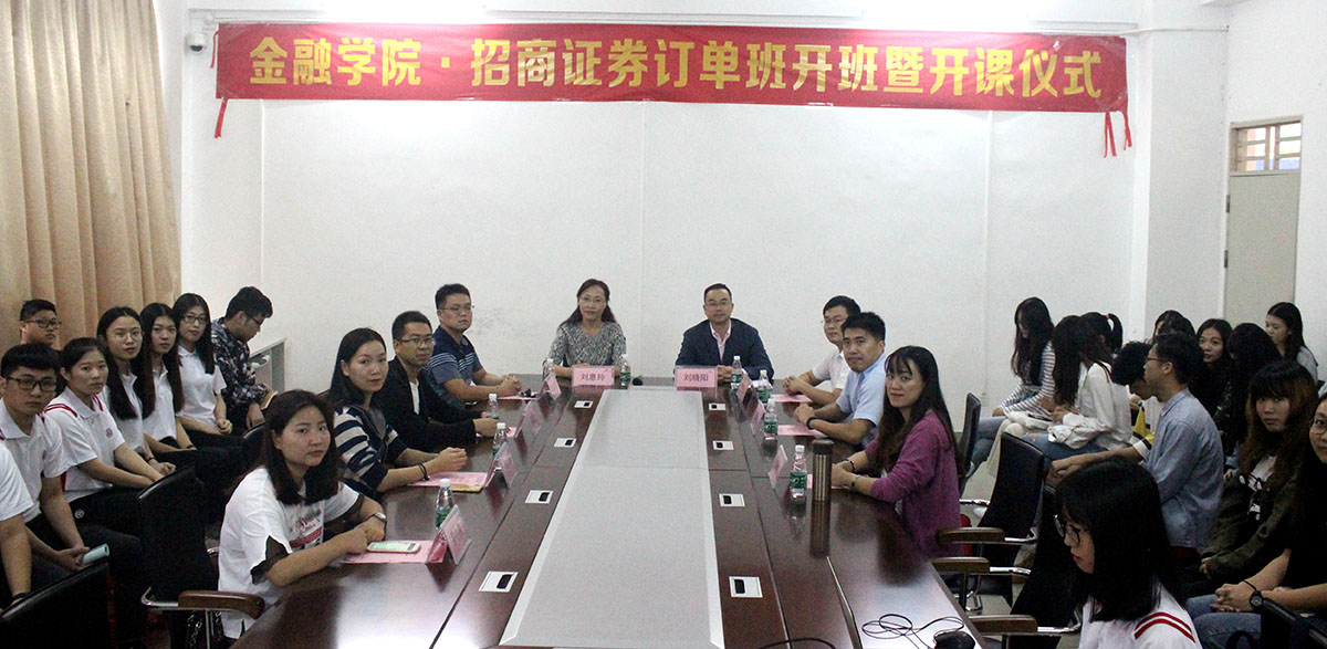 2018年10月16日下午,金融学院招商证券订单班开班仪式在创新楼二楼会议室隆重举行。金融学院刘惠玲院长、金新凯副院长、教学助理印长副老师及金融学院教师代表、招商证券公司刘晓阳总经理、肖宇辰、黎博闻经理以及订单班的学员参加了开班仪式。