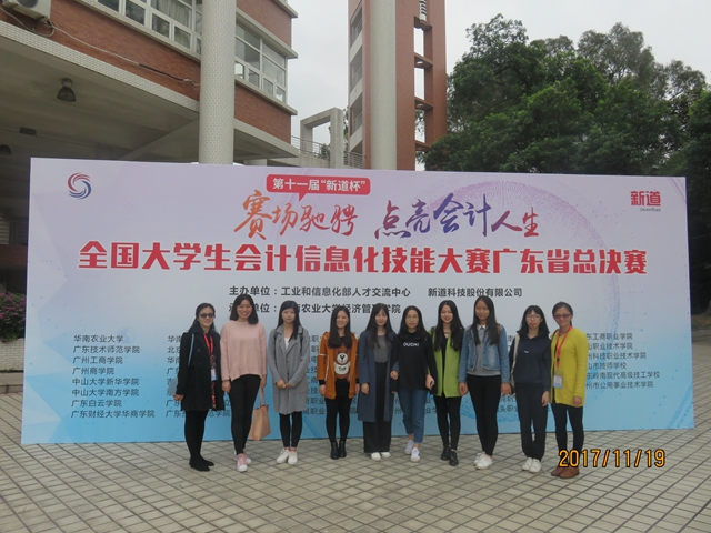 11月19日,我系由教学副主任殷建玲和肖大乔老师带队,派出两组队员共8名学生前往华南农业大学参加2017年“新道杯”全国大学生会计信息化技能大赛广东省总决赛。该大赛是工业和信息化部人才交流中心与新道科技股份有限公司为提升大学生就业与创业能力,培养、发掘创新型、实用型、复合型人才,为企业选拔人才提供实践能力的考查依据而举办。竞赛的内容是模拟商业企业一个月的业务处理,具体包括总账、报表、固定资产、应收应付、薪资、采购、销售、库存、存货,新增管理会计等,历时180分钟。参赛同学赛前刻苦训练,呈现了敢于拼搏竞技精神,其中陈维洁同学获得个人三等奖,但最后两只参赛队伍在赛场上没能很好地发挥,惜获优秀奖。