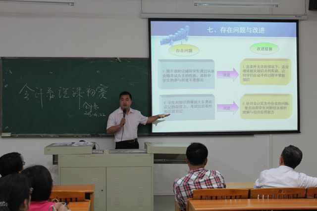 为推动教研活动不断更新和发展,加速教师专业化成长的进程,专业会计教研室于4月22日晚上7:30在博B306举行了说课比赛。陈少兰、谢卓涛、殷建玲、邓一帆和李琳芳老师参加了比赛,刘维、杜中山、徐玉水老师作为评委进行指导,并邀请我系老师出席交流探讨。