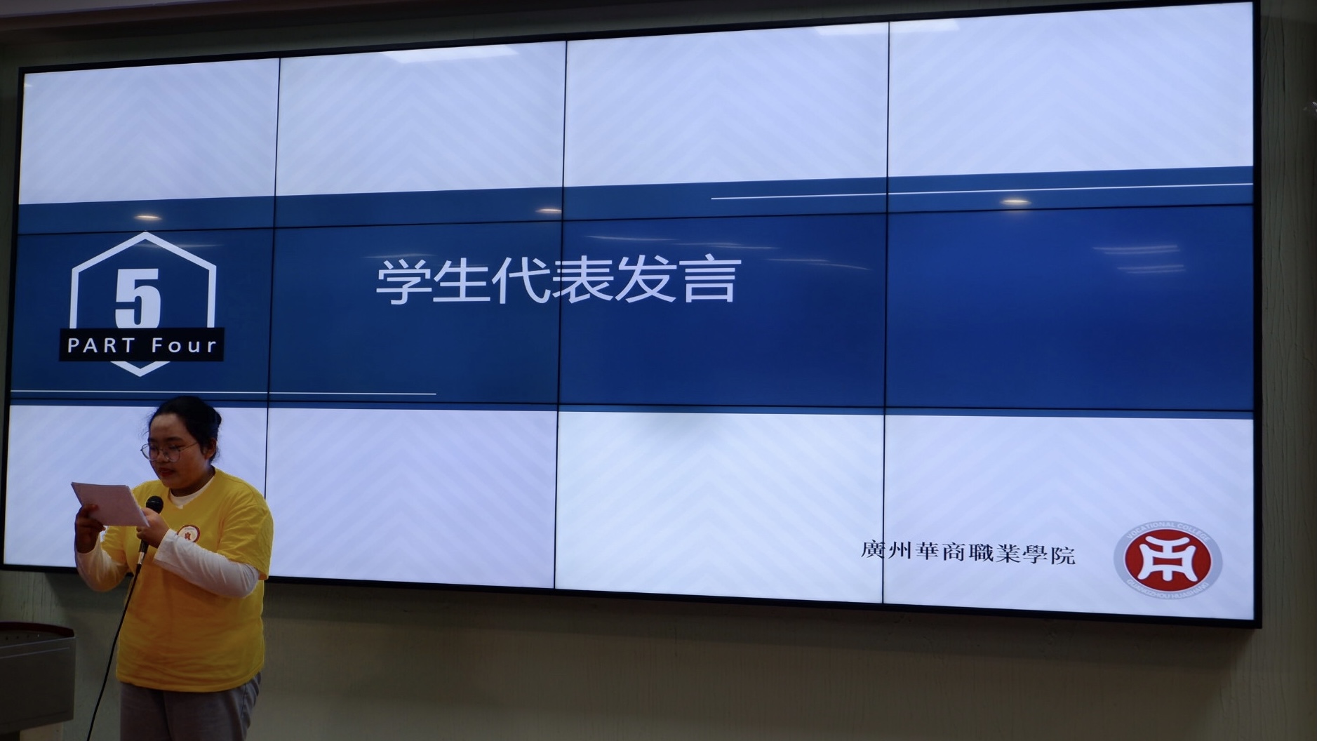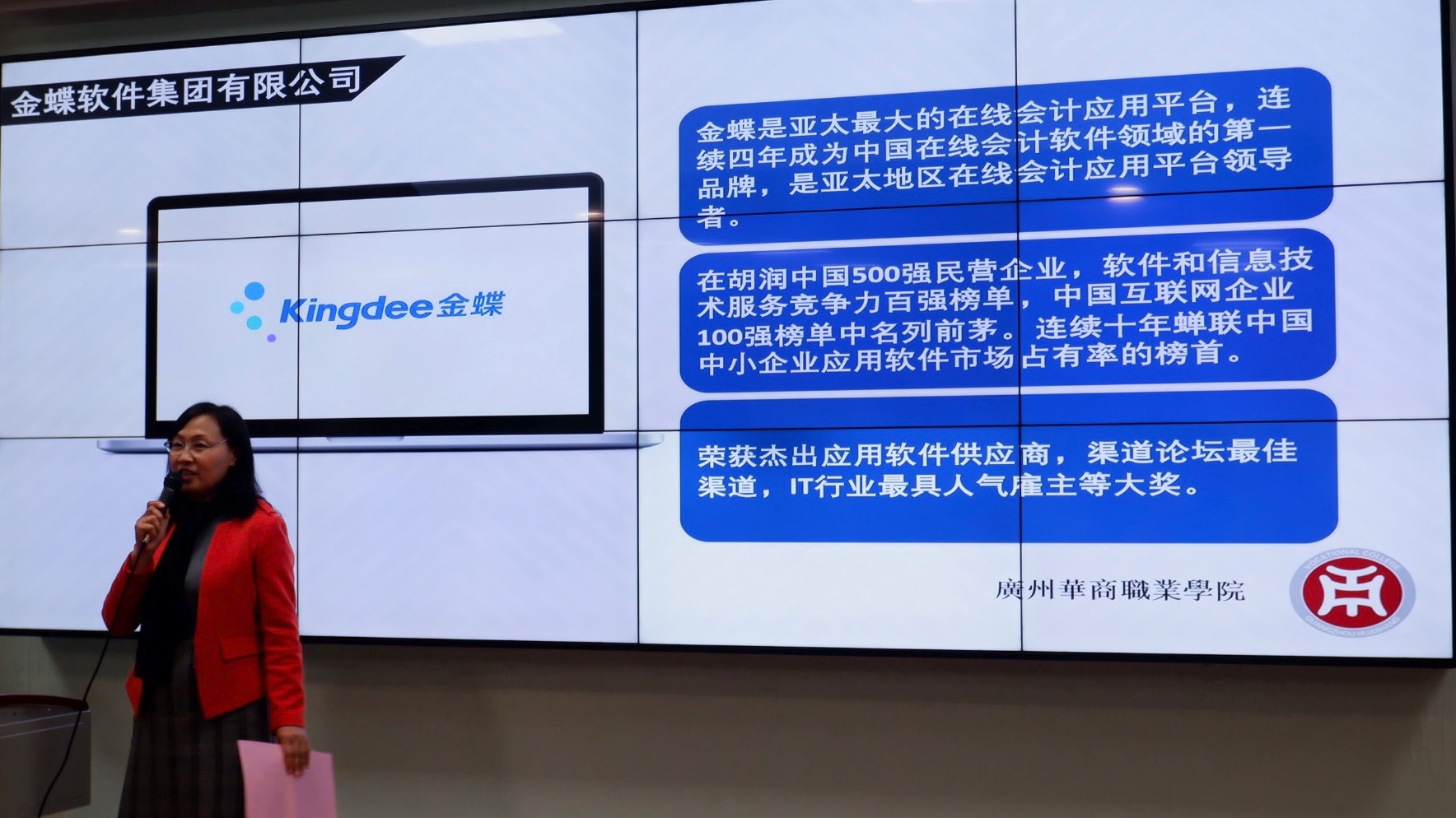 紧接着,由学生代表卢耀阳同学上台发言,首先她向我们分享了自己参加金蝶订单班的经历和感受,并表示在未来的时间,与同学们并肩作战,提高自己的业务能力,不辜负企业和学校的期望。