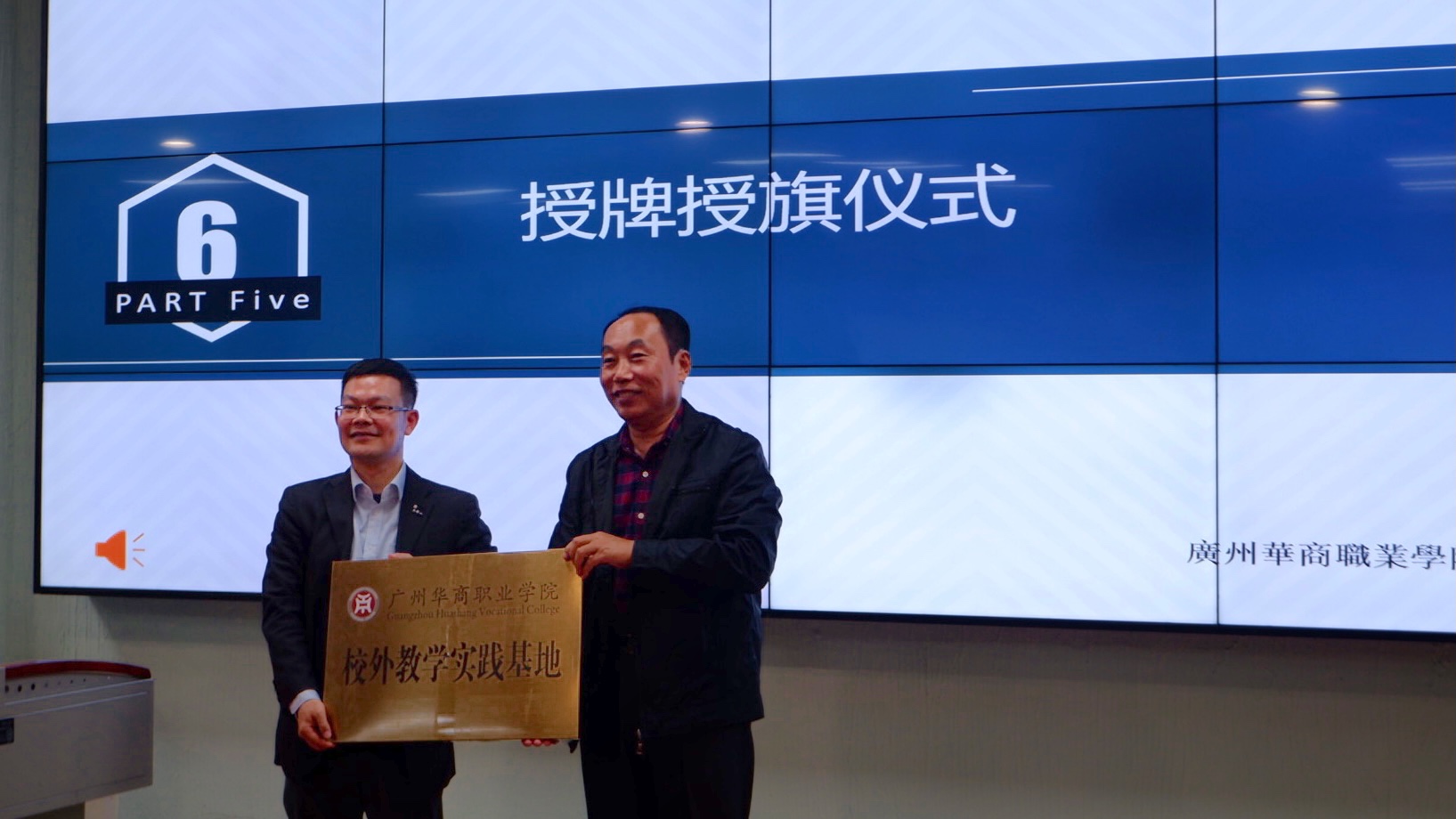 随后进行了授牌仪式,由刘玉东副校长和魏佳丹总监进行授牌仪式;由刘惠玲院长、魏佳丹总监和王思浩同学、陈明玉同学进行授班旗和授班服的仪式。