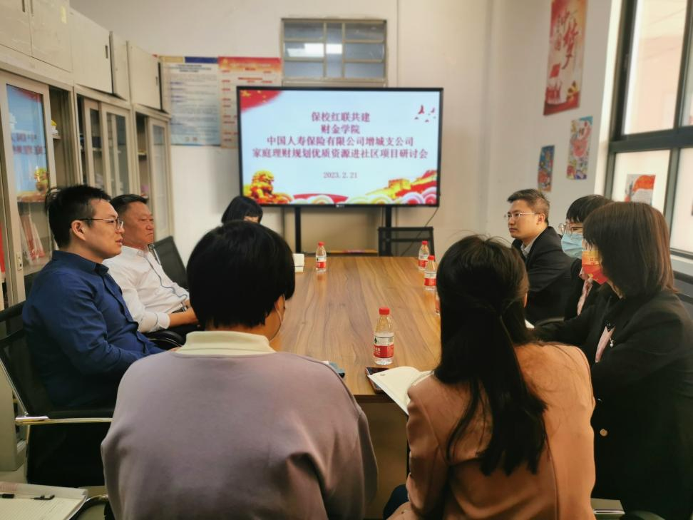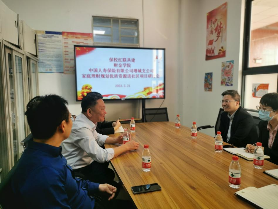 2023年2月21日上午,财金学院与中国人寿保险有限公司增城支公司围绕进一步推进党建共建,开展高质量的党建活动,提升财金学院社会服务功能,深化继续教育质量工程项目建设,促进毕业生就业进行了深入研讨。中国人寿保险股份有限公司增城支公司总经理陈根、财金学院院长李哲教授、党总支金新凯副书记、陈少兰副院长、骆玉兰主任、就业办陈健颖科长等,出席了此次研讨会。