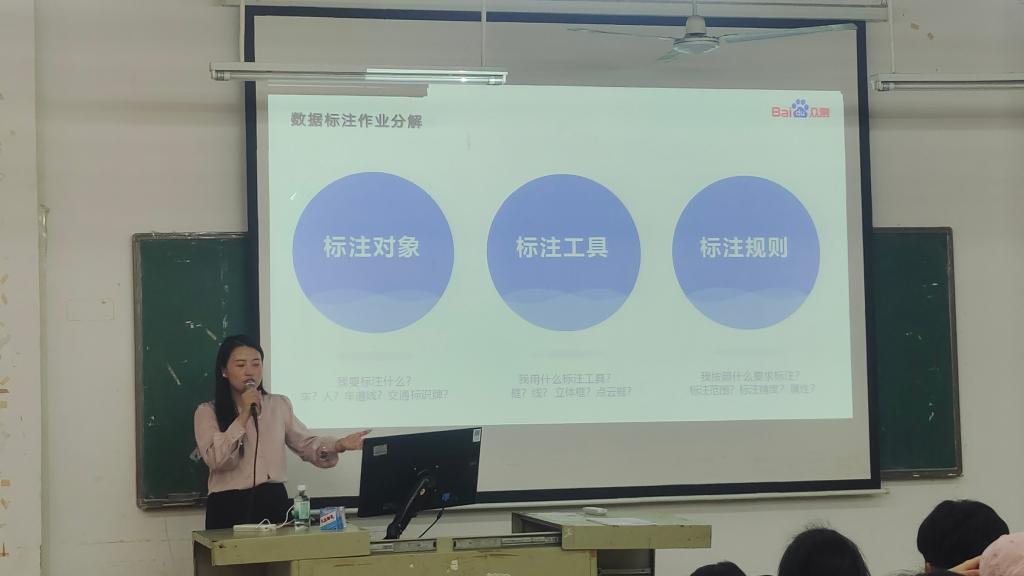 讲座上,欧总指出,随着AI技术向垂直领域加速渗透,高质量数据标注成为决定算法精度的核心环节,“未来十年,数据标注师或将成为需求最旺盛且薪酬最高的新兴职业之一”。她结合行业案例,解析了数据标注团队的运作模式及技术要求,并详细介绍了国家《人工智能训练师职业技能标准》的认证体系,强调“技能+认证”双轨制对职业晋升的重要性。现场,她还展示了银雁科技与百度云合作的数据标注项目,通过真实业务场景呈现行业动态与技术规范。
