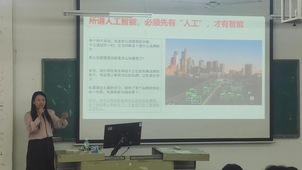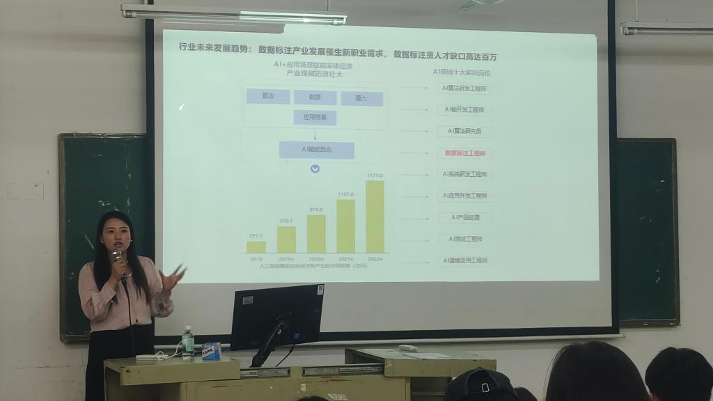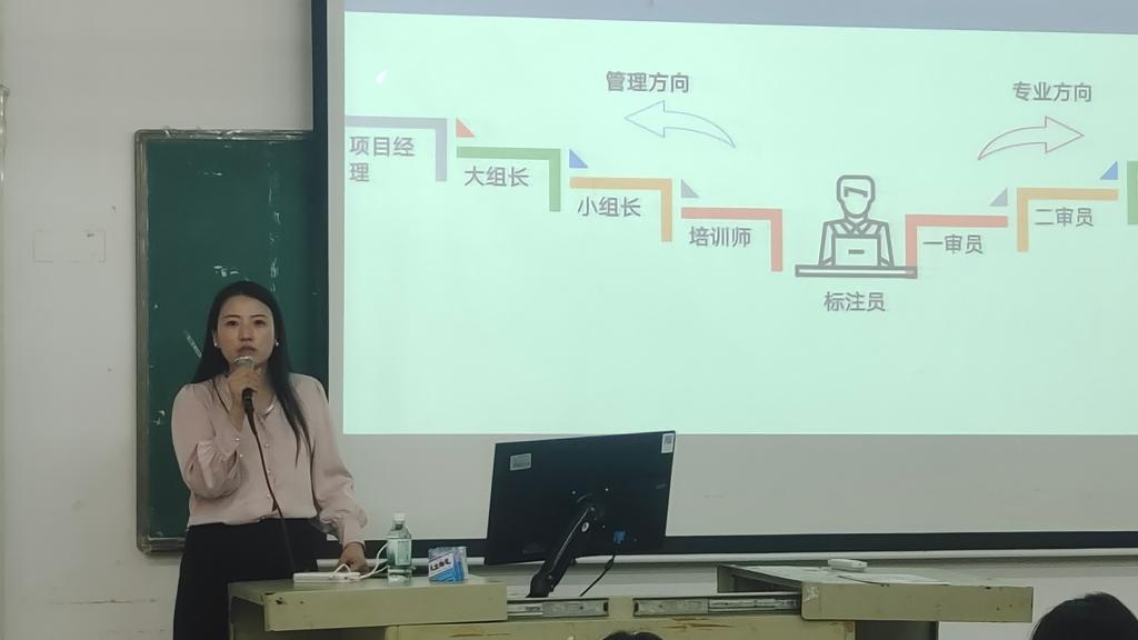 2025年5月14日,广东银雁科技服务有限公司产品经理欧清霞应邀来校,为师生带来题为“人工智能数据标注职业发展”的专题讲座。讲座围绕数据标注行业的发展趋势、职业路径及行业认证等内容展开深度分享,吸引了近200名师生参与。