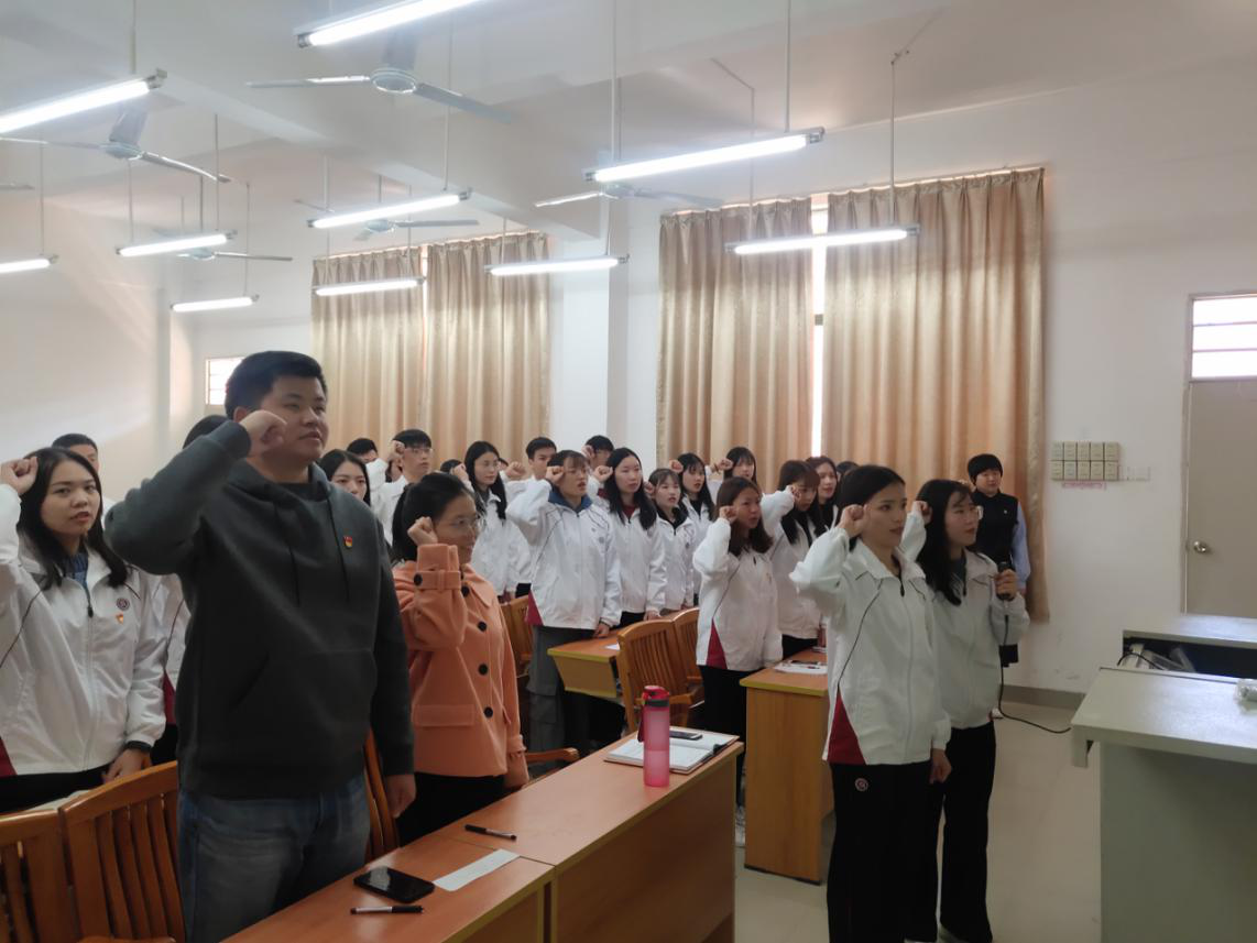 全体党员起立,对誓言重温,由优秀学生党员黄泽玲同志带领学生党员进行入党宣誓。