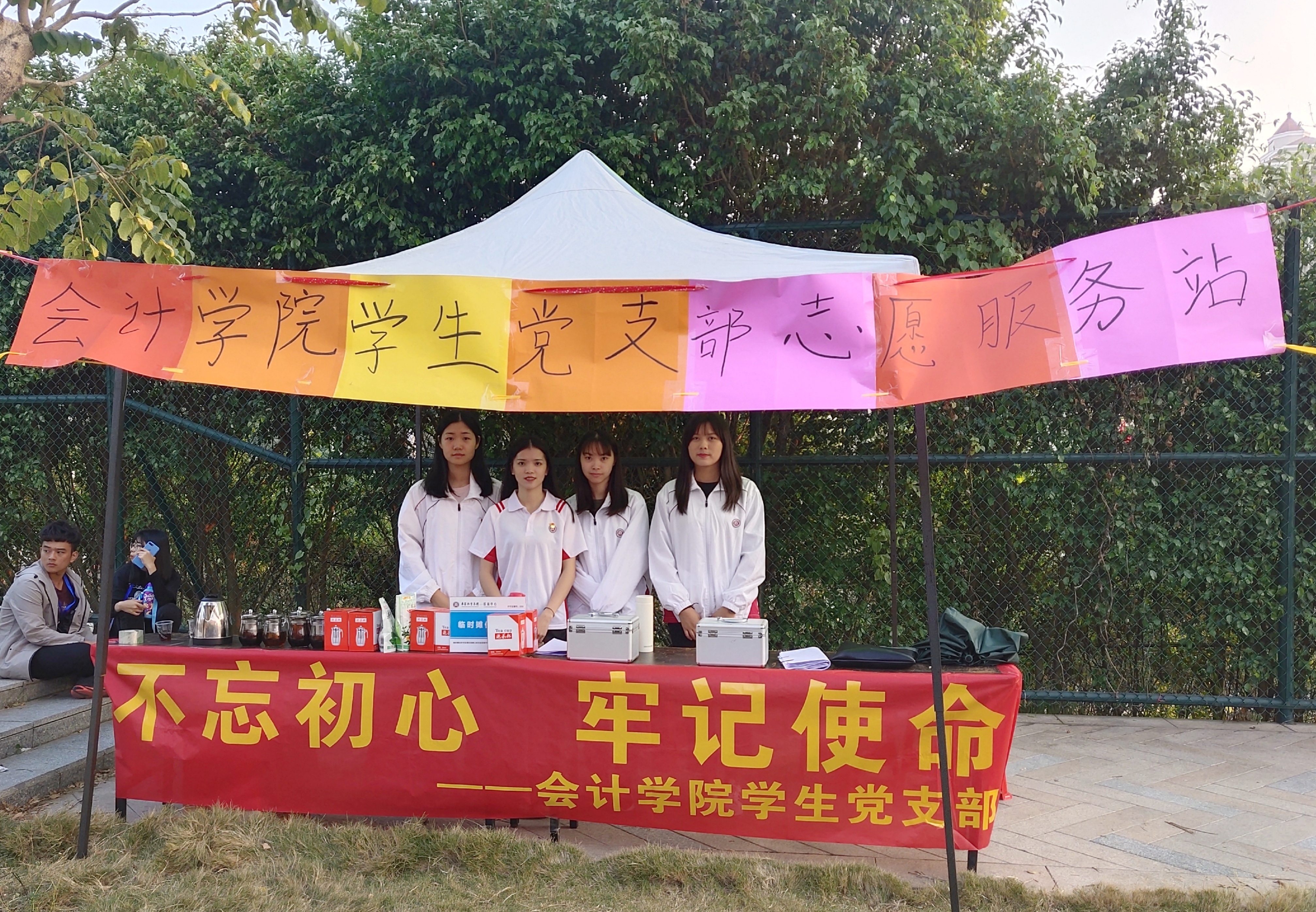 为进一步推进“不忘初心,牢记使命”主题教育扎实开展,增强学生党员的服务意识,充分发挥党员的先锋模范作用,会计学院学生党支部于11月14日~11月16日在创新楼前新生军训场地设立志愿服务站点,为军训中的新生们提供后勤服务和基本的医疗保障,助力新生军训!