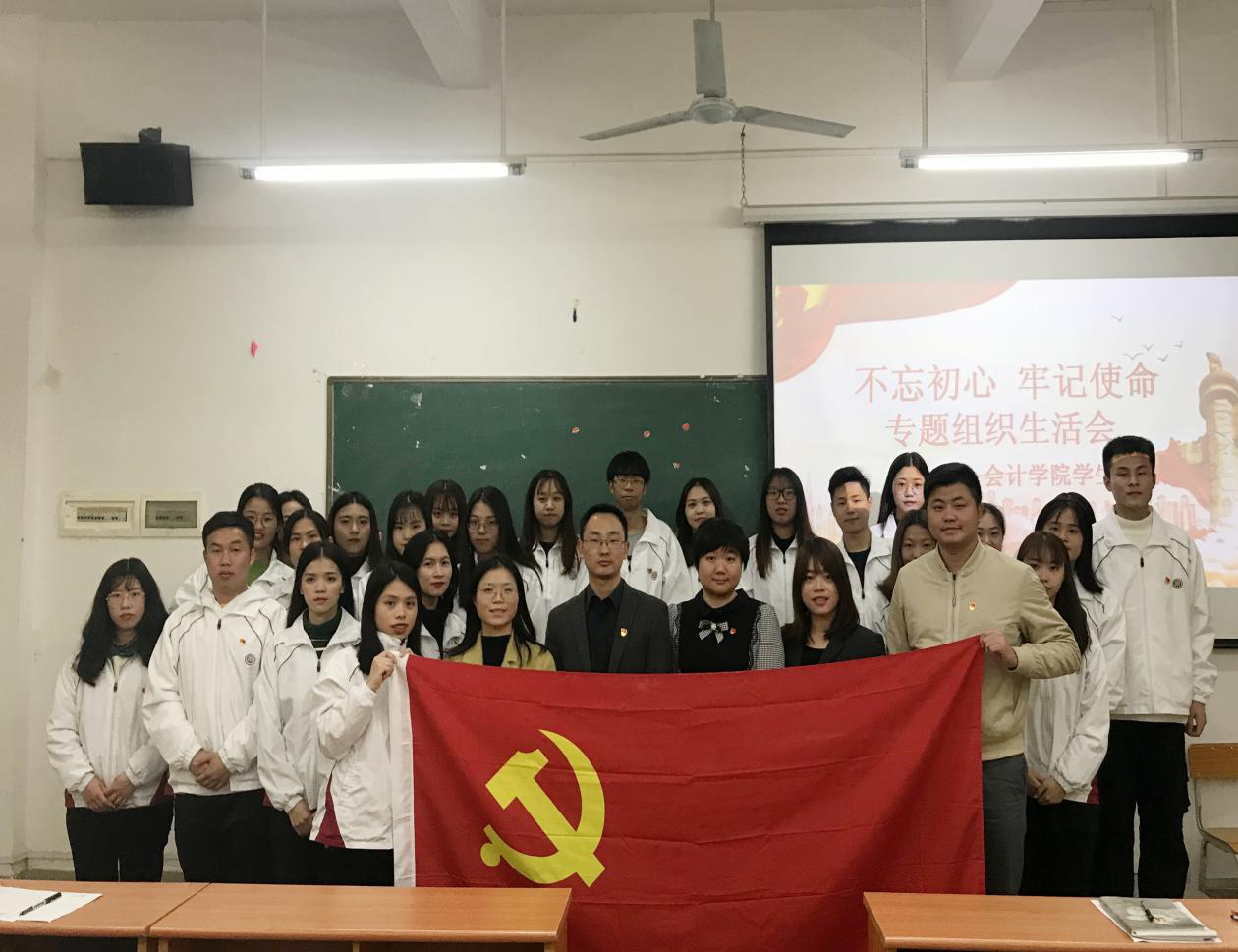 2019年12月5日晚上19:10,会计学院学生党支部于博B205召开“不忘初心,牢记使命”专题组织生活会。出席本次会议的有会计学院党总支何标书记、会计学院学生党支部刘潇书记、林汶樱副书记、党员老师以及全体预备党员。本次会议由林汶樱副书记主持。