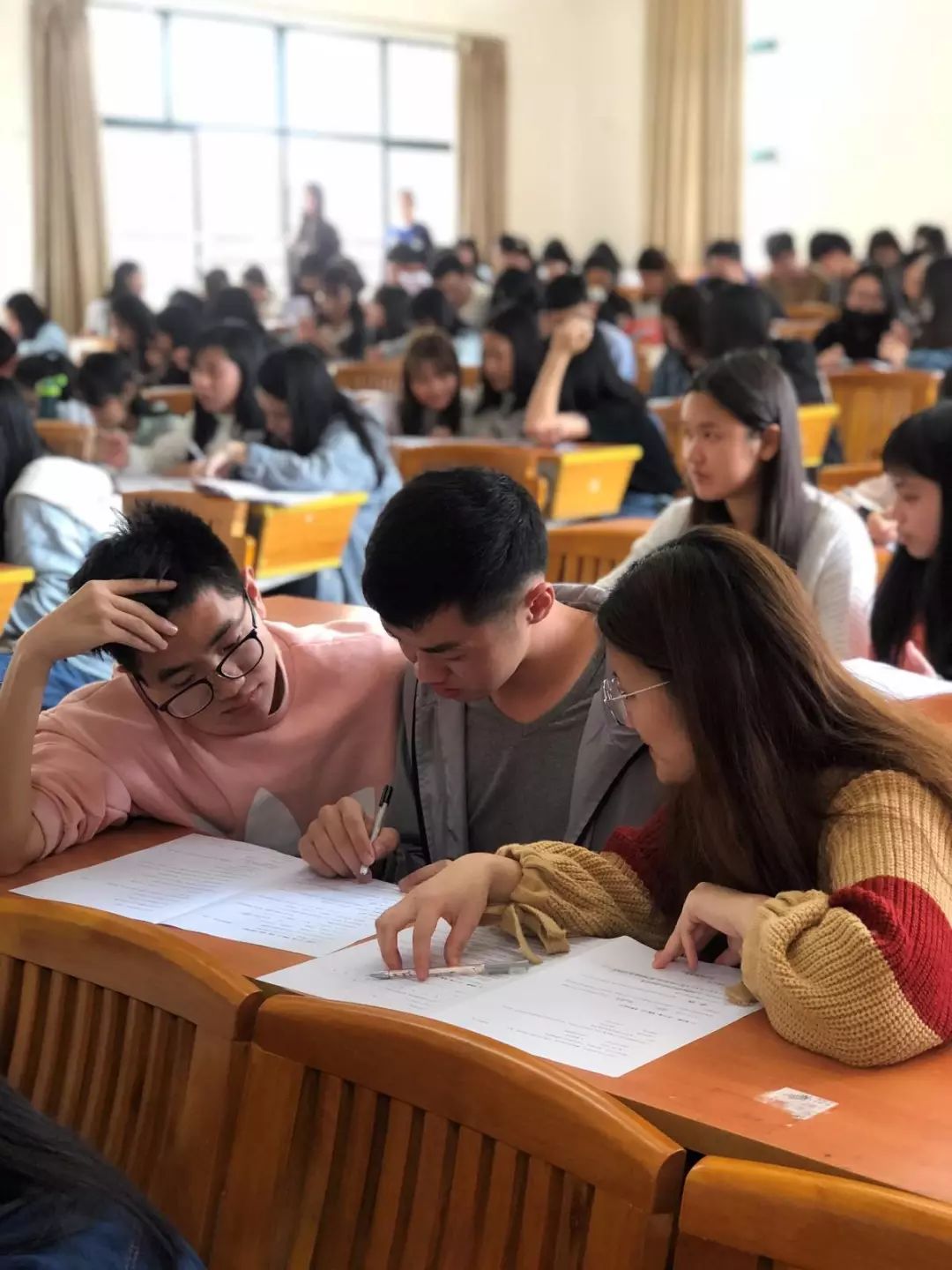 本次比赛共有2016级,2017级104组队伍312人参加。本次考试采取三人为一组共同完成一份试卷的模式进行,考试开始,考场监考人员宣读考试规则,随后,同学们开始认真作答,细声讨论,他们团结协作、默契配合,展现出了同学们对这场考试的认真态度和重视程度。