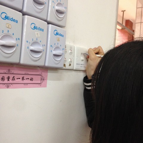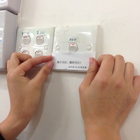 博学楼教室开关键多,老师、同学都颇感不便。为了促进同学对党的认知,加强党员的使命感,提高党员的思想觉悟,3月17日下午 会计系14-15级党支部举行优化课室环境志愿服务活动活动。将博学楼BC栋教室里的灯和风扇按钮区进行标注和区分,让老师、同学们每次开灯和开风扇都能节省时间,而不用每一个按钮都去尝试。