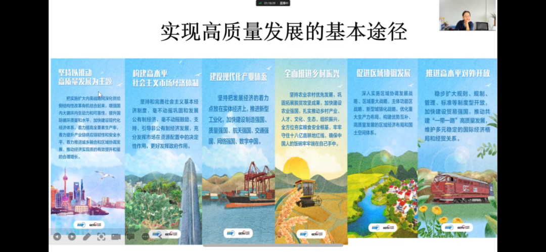孙方煜老师从党的二十大报告中总结了此次授课的四大要点:“从现在起中国共产党的中心任务”,“什么是中国式现代化”,“如何推进中国式现代化”和“前途光明,任重道远”。并为我们总结了实现高质量发展的六个基本途径。