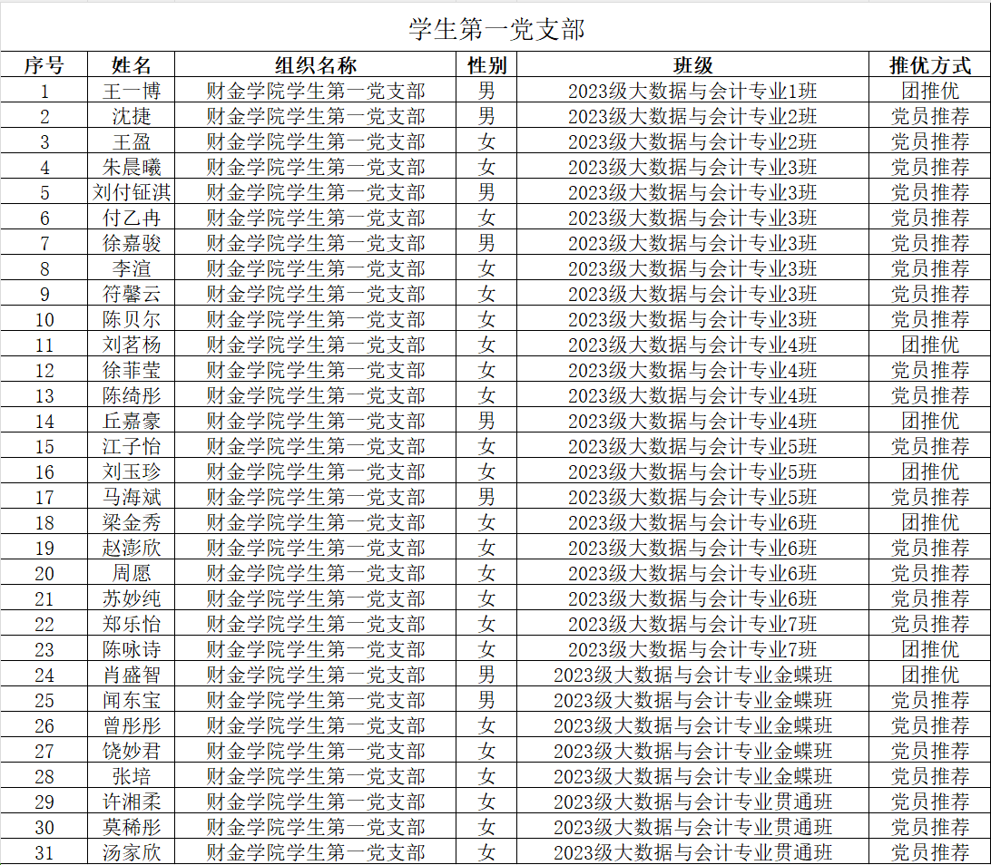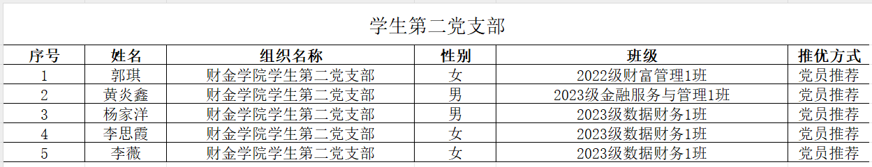 根据《关于认真做好2024年春季学期确定入党积极分子工作的通知》文件要求,经本人申请,结合班级推选、团推优、实践活动、党员和群众的意见等,财金学院学生第一、第二党支部集体研究讨论后,拟认定郭琪等36位同学为入党积极分子,现予以公示(具体名单如以下表格)。