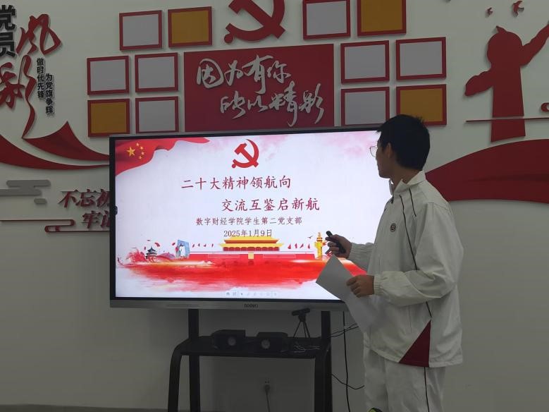 党的二十大为党和国家事业发展擘画了宏伟蓝图,指明了前进方向。在这一重要历史背景下,为使同学们更加深入了解二十大重要思想与战略部署,特举办此次学习交流会,以掀起深入学习热潮,强化思想,助力在新征程上勇毅前行。数字财经学院学生第二党支部于2024年12月24日在文科楼220党员活动室开展“二十大精神领航向,交流互鉴启新航”二十大学习交流活动。