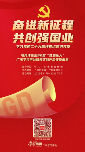 为持续深化我院学子对党的二十大精神的理解与认识,大力营造学习党的二十大精神的浓厚氛围,财金学院党务小组积极组织我院学子参加由中共广东省委宣传部指导、“学习强国”广东学习平台主办的“奋进新征程 共创强国业”——学习党的二十大精神理论知识竞赛活动,现将活动相关事项通知如下。