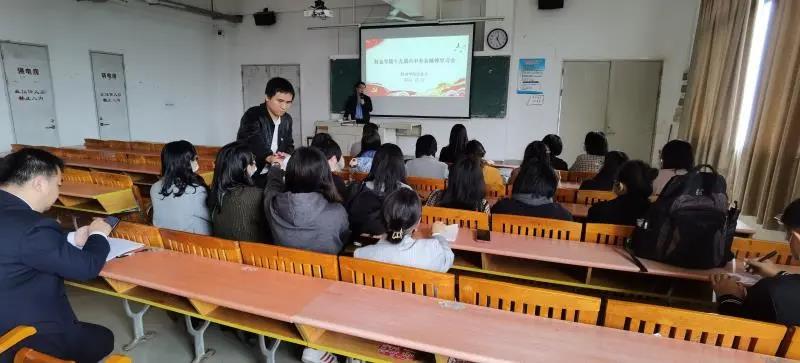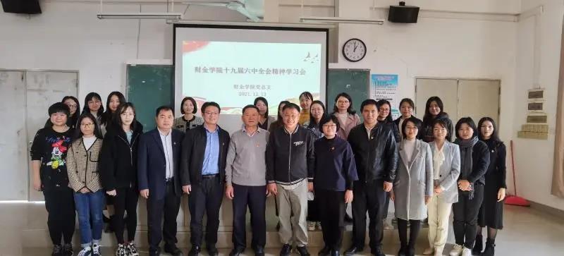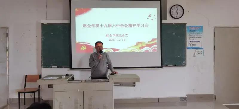 12月13日中午12点30分,财金学院党总支在博学楼召开十九届六中全会精神学习会。财金学院党总支书记李哲、副书记金新凯以及全体党员教师参加学习会。会议由金新凯副书记主持。