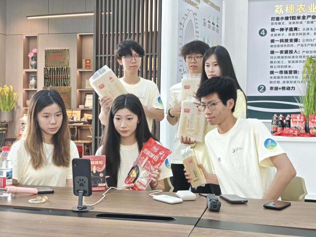 实践队直播带货为丝苗米拓新销路。直播间里,田间实景与加工样品相映,主播讲解其特质及背后农科心血。32488次实时点赞中,队员们既推荐了优质农产品,更讲好了乡村产业故事,让增城丝苗米香传万家,打通“从田间到舌尖”的便捷通道。