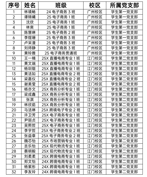 为进一步提升发展党员工作公开度,强化民主监督力度,确保发展党员的质量,根据上级有关要求,经学院党总支召开会议讨论,结合学生个人综合表现以及辅导员、班主任、其他党员老师等评价,现将数字商务学院党总支发展对象名单公示如下: