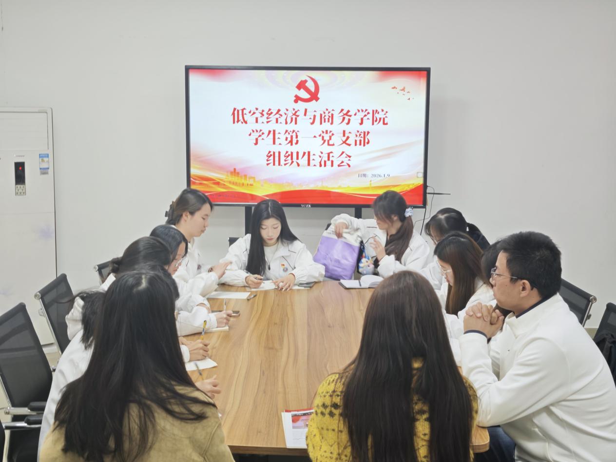 低空经济与商务学院学生第一党支部于2026年1月9日在博A509会议室召开组织生活会。支部书记周冰娜、组织委员张磊、宣传委员杨芳及全体学生党员出席会议。