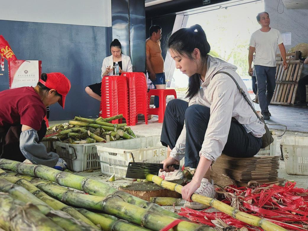 专业赋能,田间地头变课堂。在专业教师的现场指导下,学生主播们化身“农产品推荐官”,将直播间搬进田间地头。镜头前,同学们生动讲述甘蔗的种植故事,细致介绍品种特色、营养价值与多样食用方法,并现场演示甘蔗采收、削皮的全过程,让广大网友直观感受到劳动之美与农产品的原生态魅力。直播间内互动频频、热度持续攀升,一根根甘蔗通过屏幕从田间直达千家万户,切实为农户拓宽了销售渠道,实现了“滞销”变“直销”。