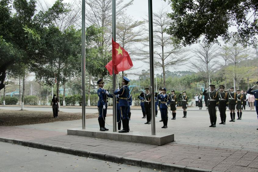2025年3月3日清晨7时30分,创实楼前广场庄严肃穆,广州华商职业学院春季学期第二周升国旗仪式在这里举行。数字财经学院杨玲院长带领辅导员、班主任老师和2023级学生整齐列队,精神抖擞,在晨光的映照下,开启了充满希望与力量的新征程。