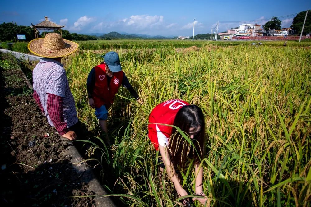 我们最先来到的是岳村村,走入村道,入目眼帘的是一大片株株饱满的稻田,犹如一幅清新的秋之画卷。漫步于田埂,便望见不远处的农民正顶着烈阳在挥舞着镰刀收割稻田,随即我队三下乡成员本着发挥志愿者精神下田帮助农民收割稻谷,一同感受丰收的喜悦。