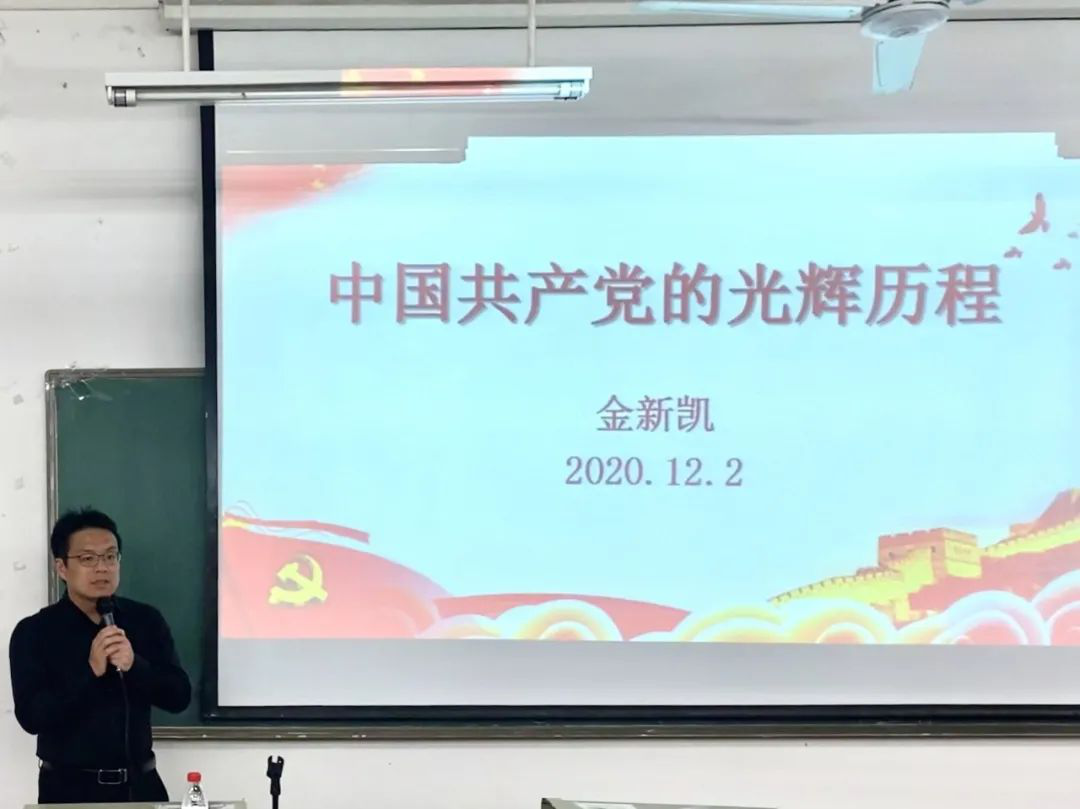 尔后,金新凯副书记为了让同学们更加深刻的体会到党的光辉历程,又分别从“中国共产党的历史背景”、“中国共产党的诞生与发展”、“中国共产党的历史成绩与使命”三个方面为同学们进行深入的讲解。