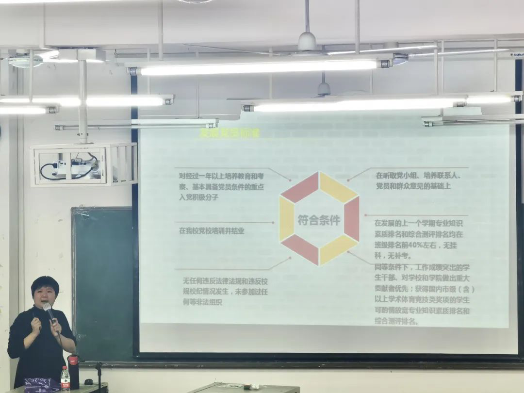 在此期间,为增强同学们对入党流程的深入了解,院学生党支部刘潇书记为同学们讲解了“入党流程”。以财金学院党组织架构、党员发展流程、党员发展要求、如何缩短距离这四个纲要介绍入党流程。刘潇书记也郑重的告诉我们要端正入党动机,在成为正式党员的道路上还充满着诸多挑战和困难,但我们可以逐渐缩小差距做更好的自己。