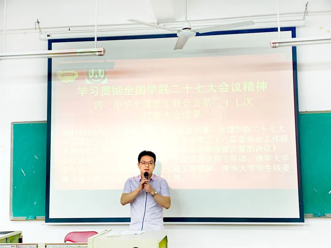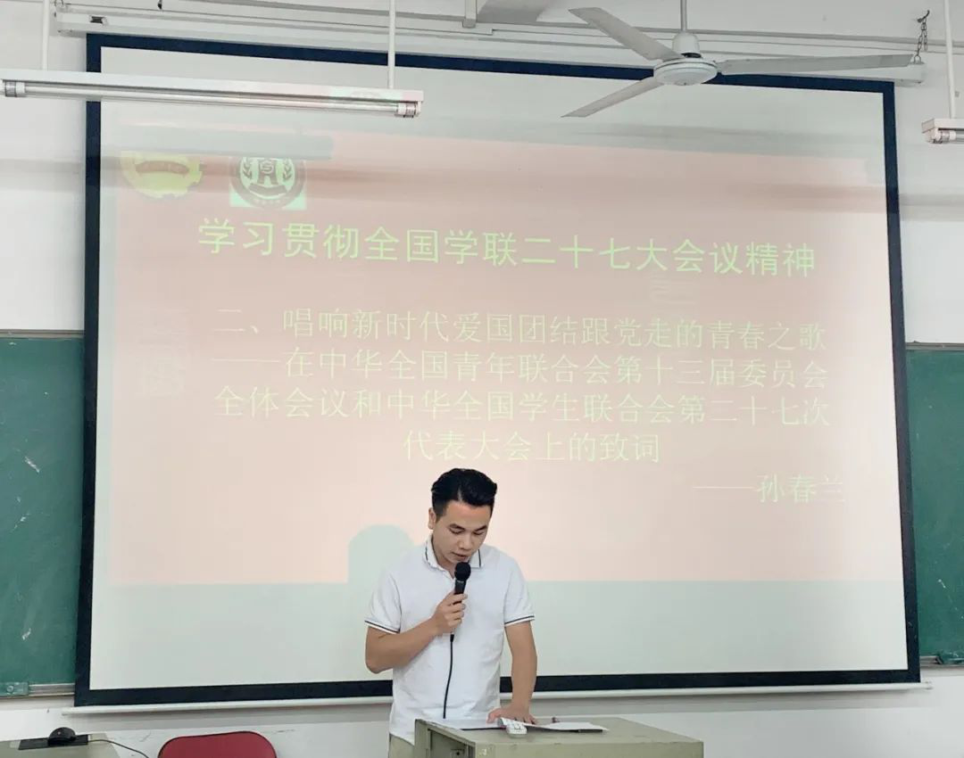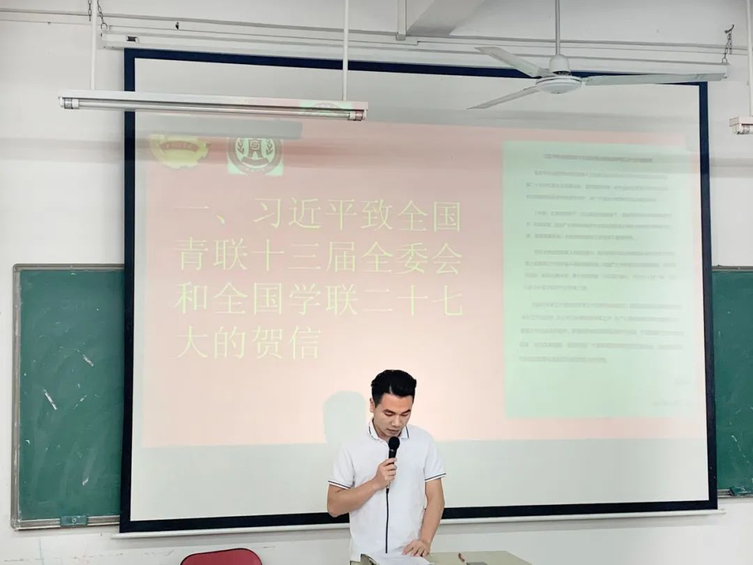 会议伊始,主要深入学习习近平总书记贺信、孙春兰副总理讲话和学联报告等内容,深刻领悟新时代青年大学生的时代责任和发展机遇。随后,梁文辉老师传达了全国学联二十七大会议精神,分享各高校学生会建设、学生工作中的共性问题和创新举措,谈到习近平总书记总是会在百忙之中抽出时间同年轻人对话,关心青年成长成才,对广大青年坚定跟党走、奋进新时代的期许,并指出了高校学生会组织改革的意义和关键点。