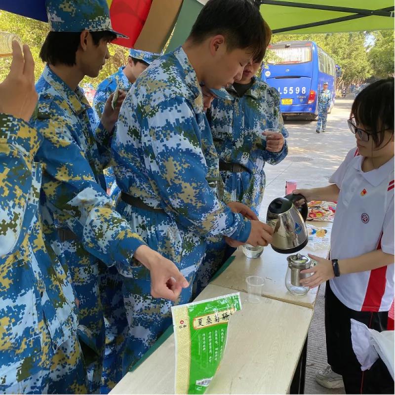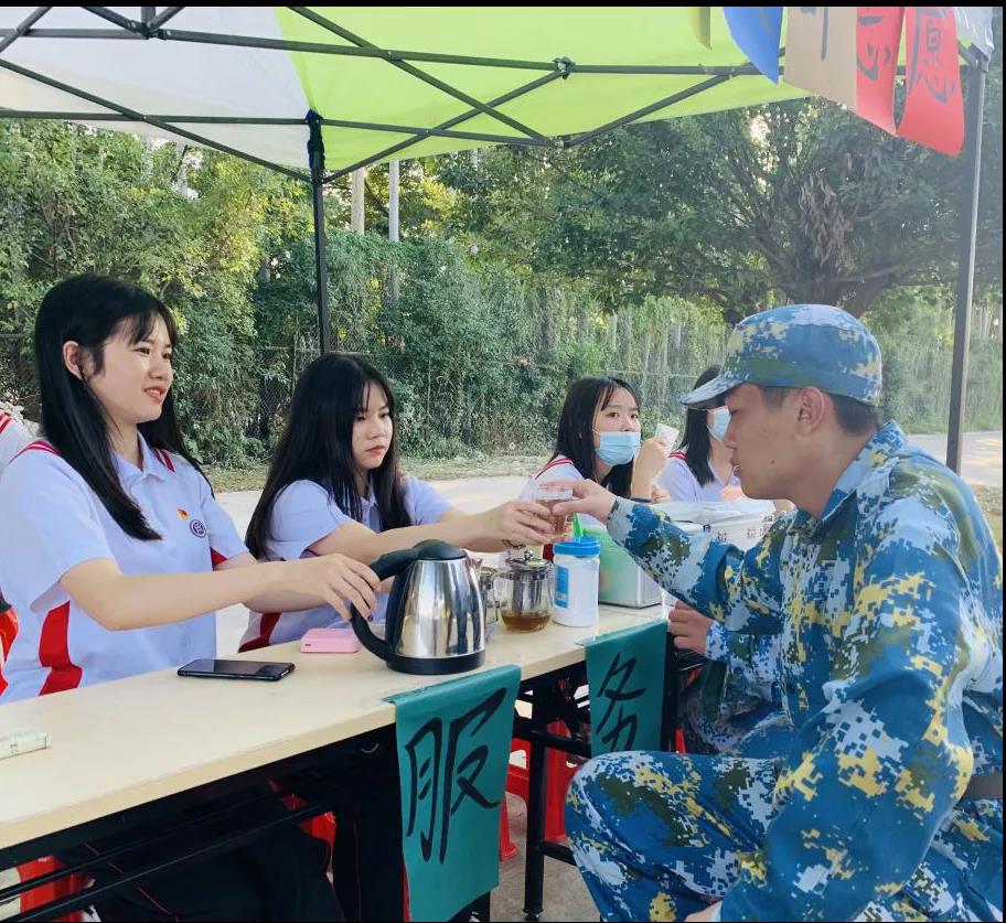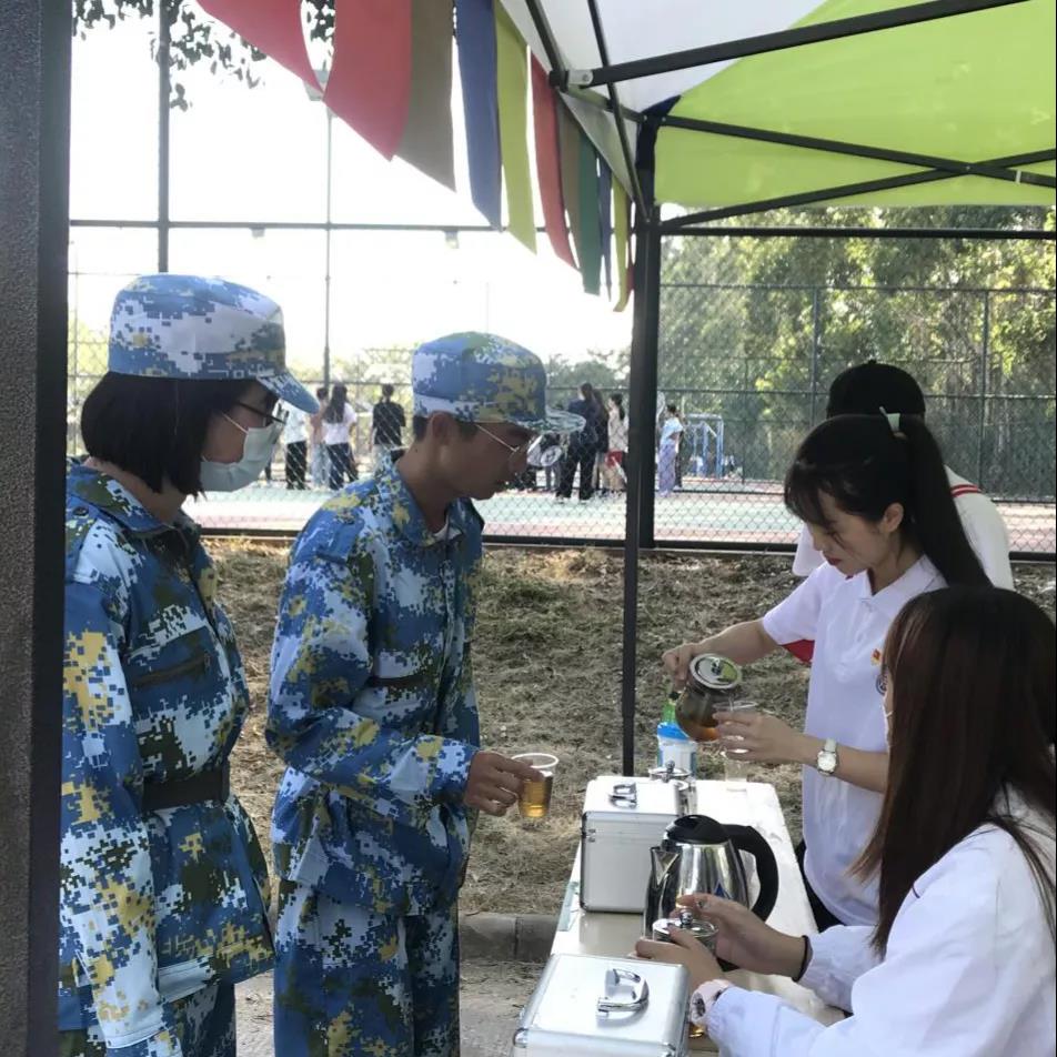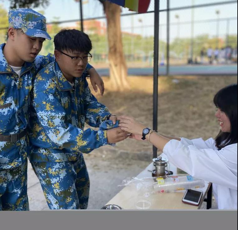 在大本营的党员们胸前佩戴党徽,以热情的服务态度为军训的顺利开展提供后勤保障工作,帮忙照顾不适的同学,协助处理现场的应急事件,让新生们更好的融入军训。新生们军训休息期间,志愿者们积极主动的给予新生们帮助。志愿服务活动将财金学院党组织的关怀汇聚成一道暖阳,照射在军训队列的每个角落。