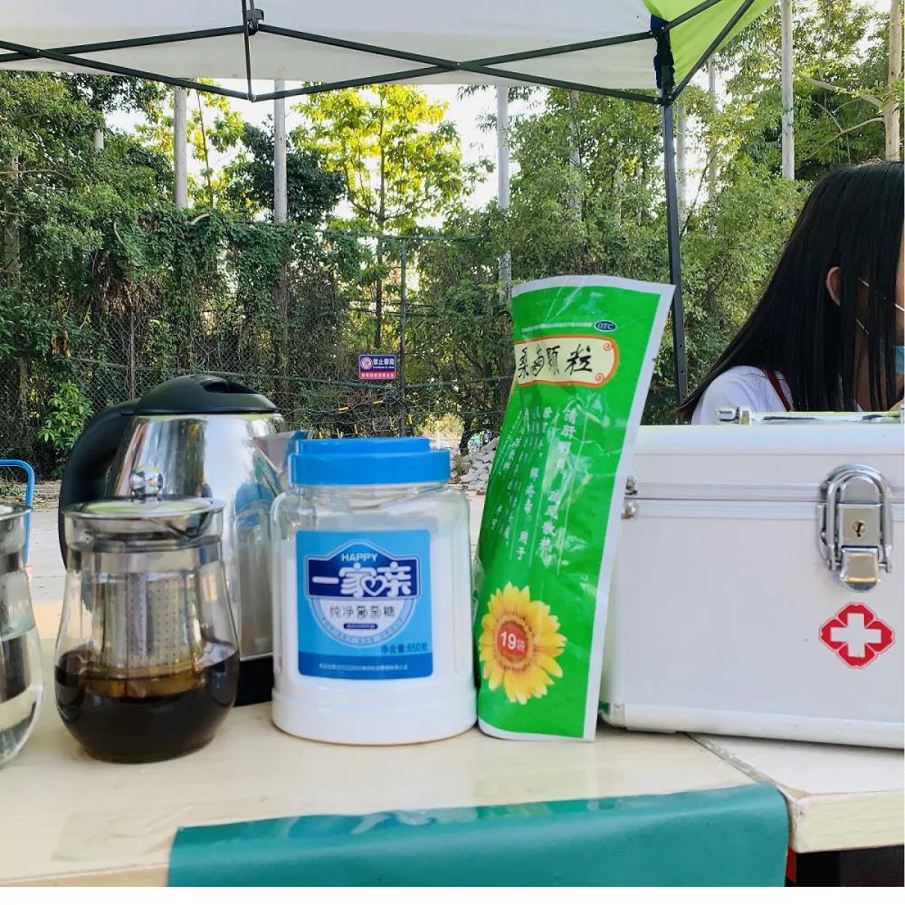 党员志愿者们早早地搭建好爱心帐篷,为新生们预备了凉茶、葡萄糖、饮用水、应急药品等,为新生们提供后勤保障。