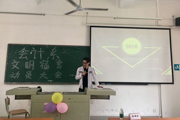 为推动宿舍文化建设,改善宿舍环境,营造温馨、友爱、文雅、和谐的宿舍氛围,我系于2018年3月30日中午在博B203召开“会计系第八届文明宿舍评比大赛动员大会”。参与本次大会的嘉宾有团学联指导老师蒋锦宏老师以及17级学生干部。