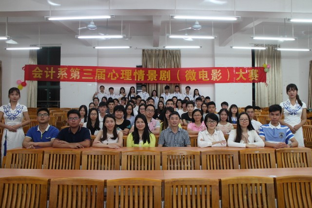 为了关心我系学生的心理健康,提高学生的心理素质,我系女生委员会于5月17日在博学楼C301举办了会计系第三届心理情景剧决赛,此届心理情景剧决赛采取了将情景剧拍摄制作成微电影的新模式。出席的嘉宾和评委分别有我系田千喜主任、殷建玲副主任、院心理咨询中心指导老师刘玮玮老师、团总支姚柏洲书记、艺术团指导老师郑傲然老师、会计学会指导老师谢梓灏老师以及各辅导员老师。
