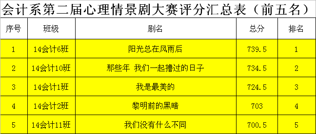 经过近一个月的积极准备,各班级在4月20号前按时提交了初赛视频,通过用心拍摄的视频带来了精彩的表演,展现了当代大学生在面对学习、生活、工作等挑战时积极向上的心理品质和乐观自信的人生态度。经过各位辅导员老师的紧张评审,初赛结果已经出来了。14级会计1班、2班、6班、10班、11班均获得700分以上的高分,脱颖而出进入决赛。