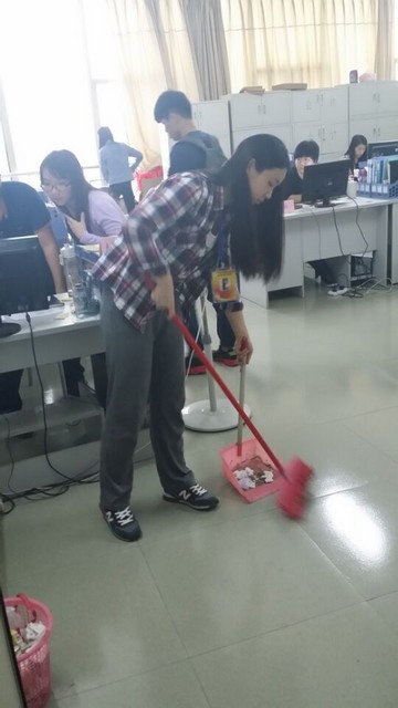 下午16点整,党务助理团的干事准时来到创新楼5楼集合。干事们手持清洁工具,向着不同楼层和办公室出发,分工合作。各干事埋头苦干,专心致志地打扫着,不放过一处角落和一块垃圾,将每一层楼梯及两个办公室打扫得干干净净。虽是举手之劳却能让老师和同学们在洁净的环境中工作和学习。