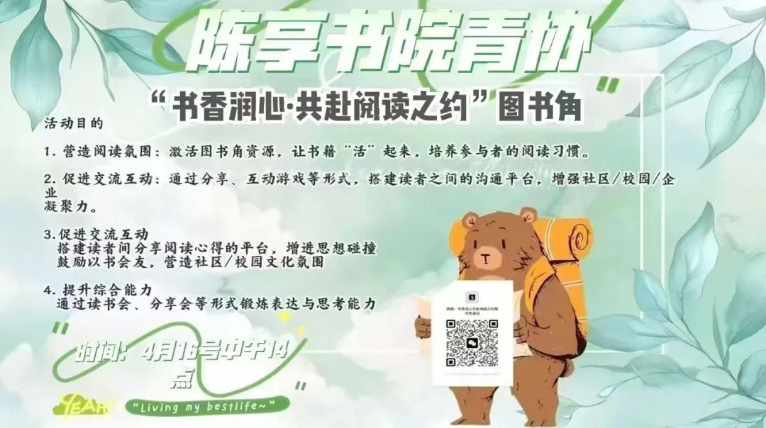 在信息化、快节奏的现代社会,碎片化阅读和电子娱乐逐渐占据人们的生活,深度阅读的习惯面临挑战。为响应国家“全民阅读”的号召,营造“爱读书、读好书、善读书”的文化氛围,同时满足人们对精神文化生活的需求,特策划“书香润心,共赴阅读之约”图书角主题活动。通过打造开放、共享的阅读空间,鼓励大众重拾纸质书籍的温度,在阅读中滋养心灵、拓宽视野,促进个人成长与社区文化共建,助力书香社会建设。 活动流程 1. 开场致辞 2.主题分享会 3.播放短视频 4.读书分享沙龙 5.“阅读心愿墙” 报名时间:2025年4月14日12:00-4月15日18:00 活动时间:2025年4月16日14:00-16:00 活动对象:江门校区数字财经学院全体学生。(人数限制为80人)。 活动地点:2号教学楼【具体待定】 活动奖励:参加本次活动的所有成员将可加1分学分。 图文:组织部 编辑:龙春锋 初审:陈慧欣 肖婷南 复审:周冰娜 终审:顾晖