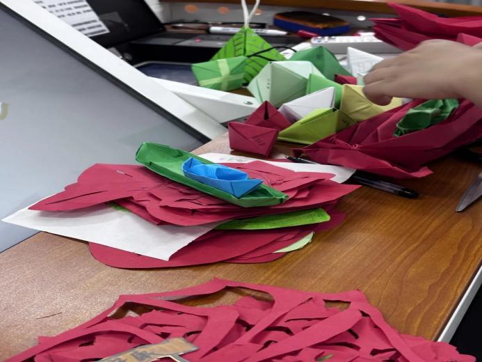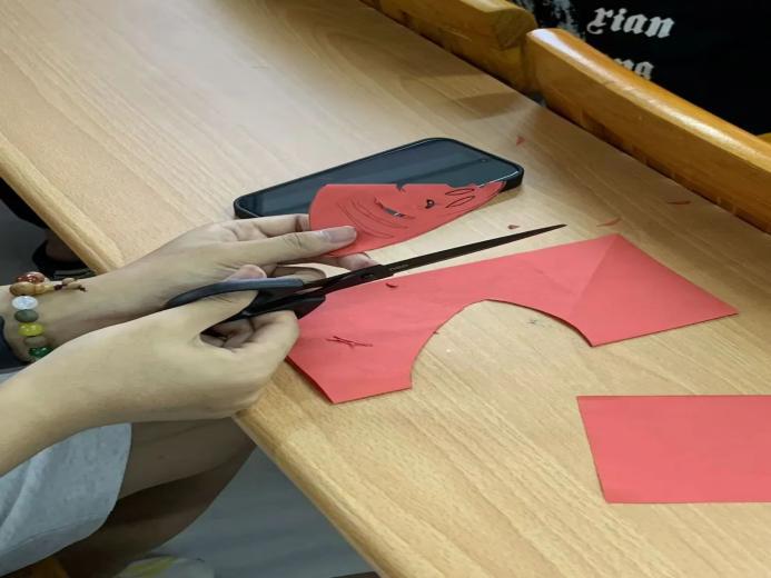在剪纸与折纸创作环节,主持人现场示范“粽子”“龙舟”等主题作品的制作技巧。学生们在一折一剪间展现对端午元素的独特诠释。最终,融合传统符号与现代审美的作品精彩呈现,生动展现了传统文化的当代生命力。活动设置作品展示与分享环节,学生代表上台介绍创作思路,将手工技艺与文化感悟相结合,传递对传统文化的热爱。