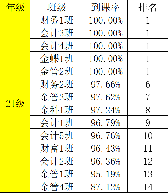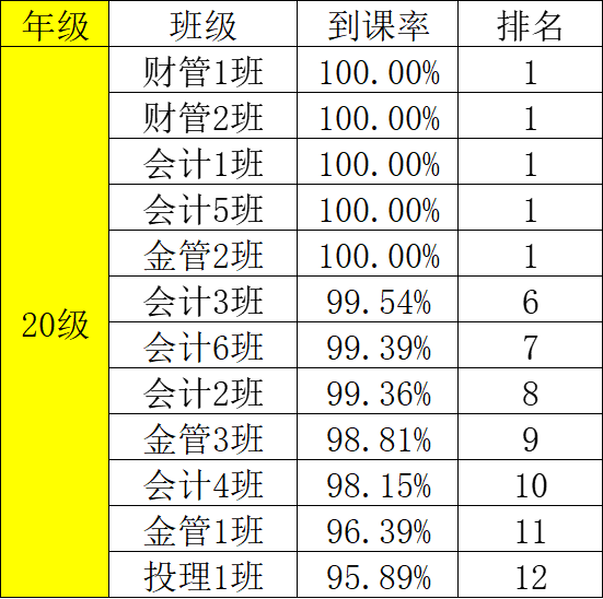 为了有效地提高财金学院学风、班风的建设,团总支纪检部对我院第二周班级课堂到课率情况进行检查,经过汇总,各班级的到课情况如下:
