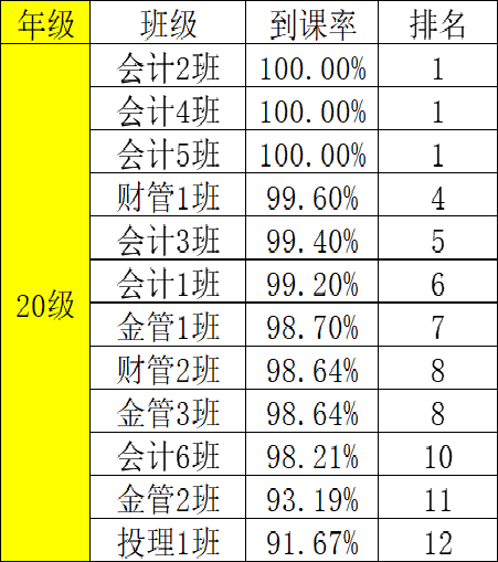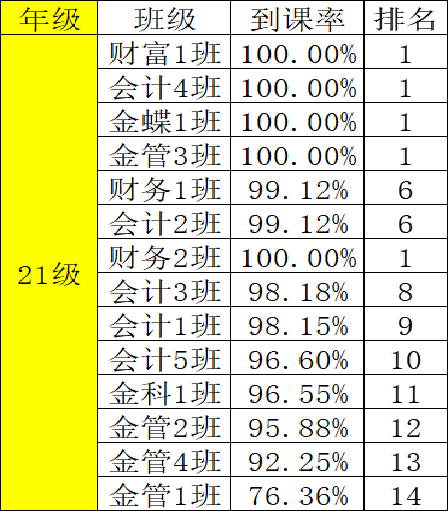 为了有效地提高财金学院学风、班风的建设,团总支纪检部对我院第五周班级课堂到课率情况进行检查,经过汇总,各班级的到课情况如下: