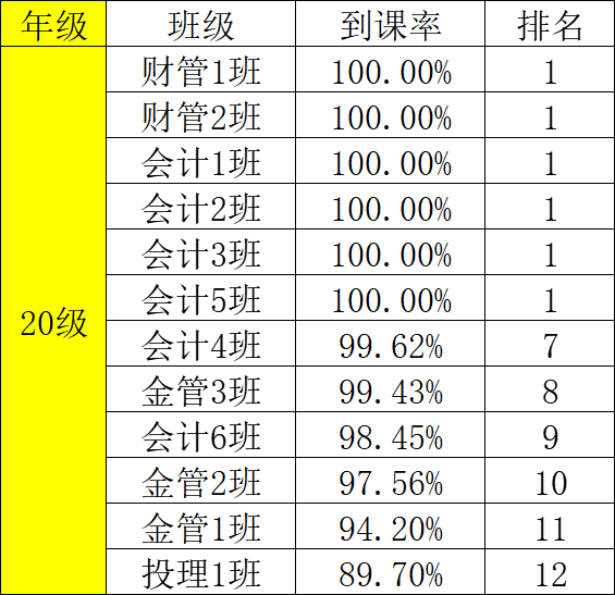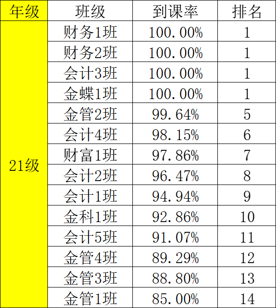 为了有效地提高财金学院学风、班风的建设,团总支纪检部对我院第七周班级课堂到课率情况进行检查,经过汇总,各班级的到课情况如下: