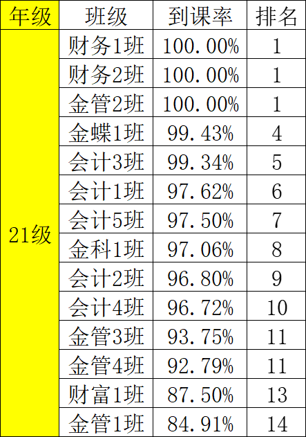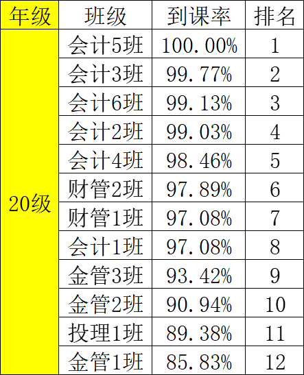 为了有效地提高财金学院学风、班风的建设,团总支纪检部对我院第十三周班级课堂到课率情况进行检查,经过汇总,各班级的到课情况如下: