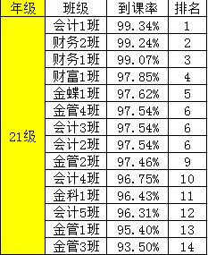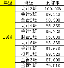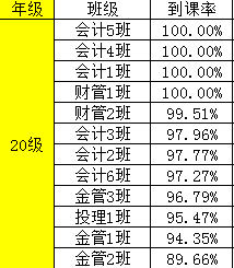 为了有效地提高财金学院学风、班风的建设,团总支纪检部对我院第九周班级课堂到课率情况进行检查,经过汇总,各班级的到课情况如下: