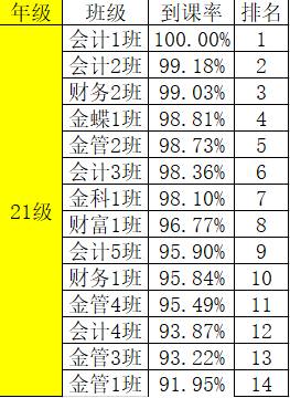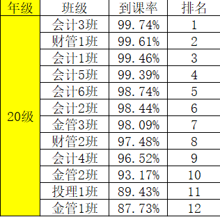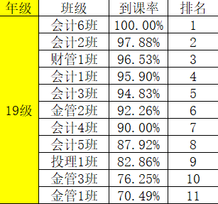 为了有效地提高财金学院学风、班风的建设,团总支纪检部对我院第十二周班级课堂到课率情况进行检查,经过汇总,各班级的到课情况如下: