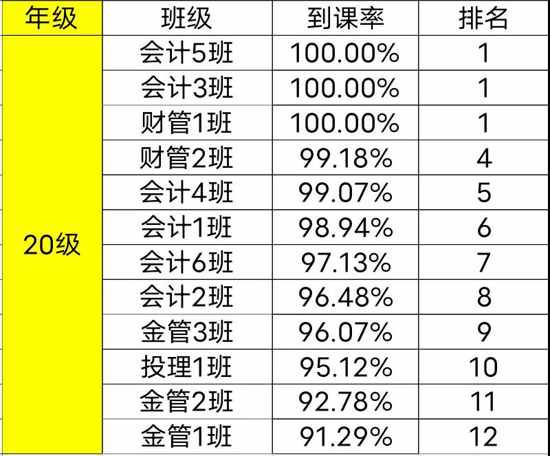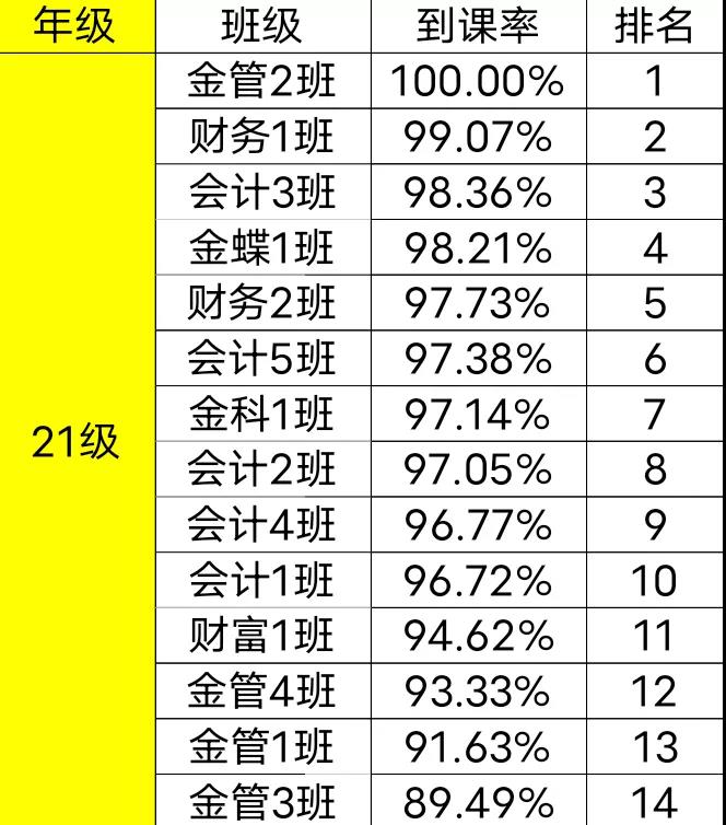 为了有效地提高财金学院学风、班风的建设,团总支纪检部对我院第十五周班级课堂到课率情况进行检查,经过汇总,各班级的到课情况如下: